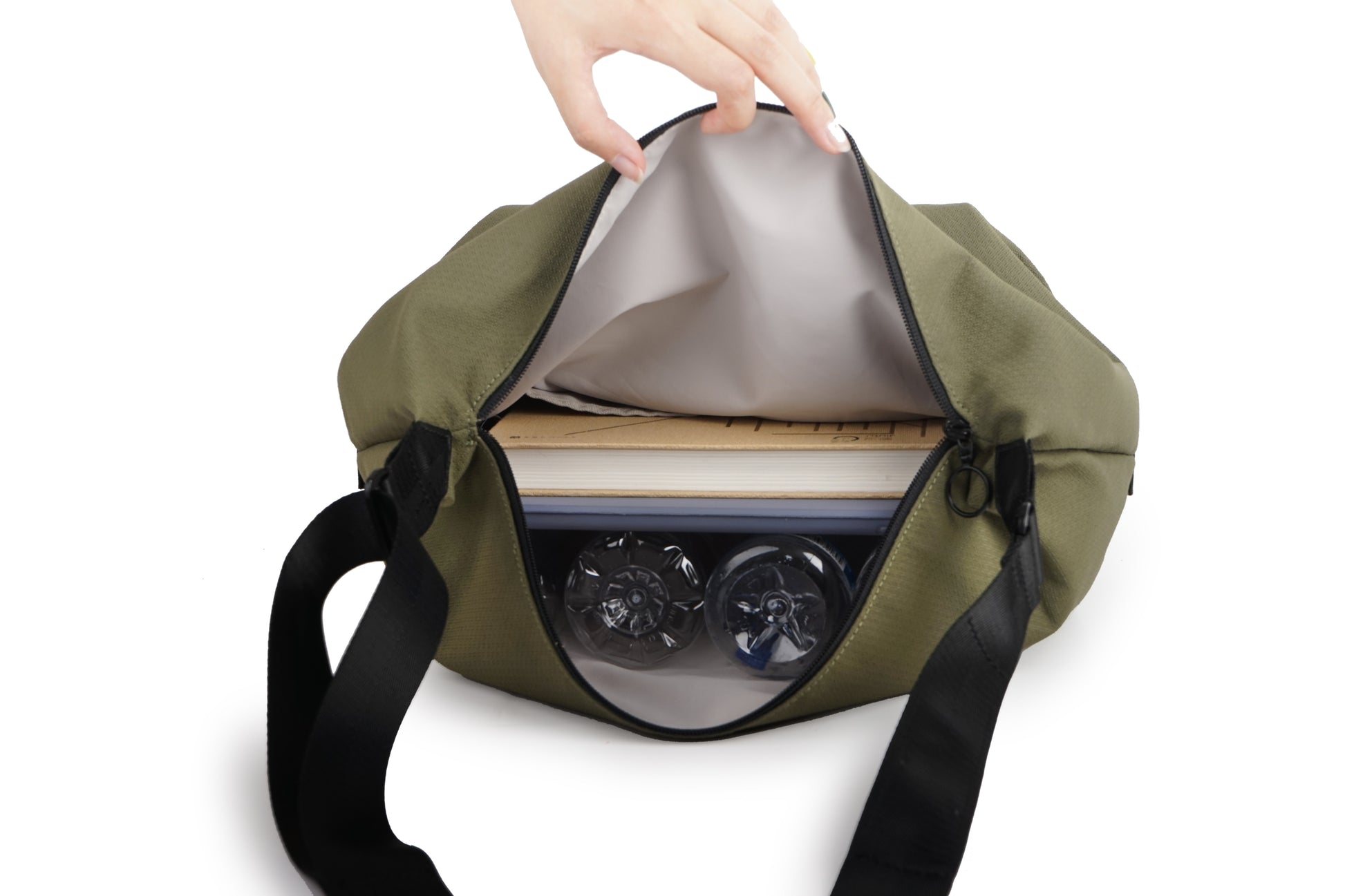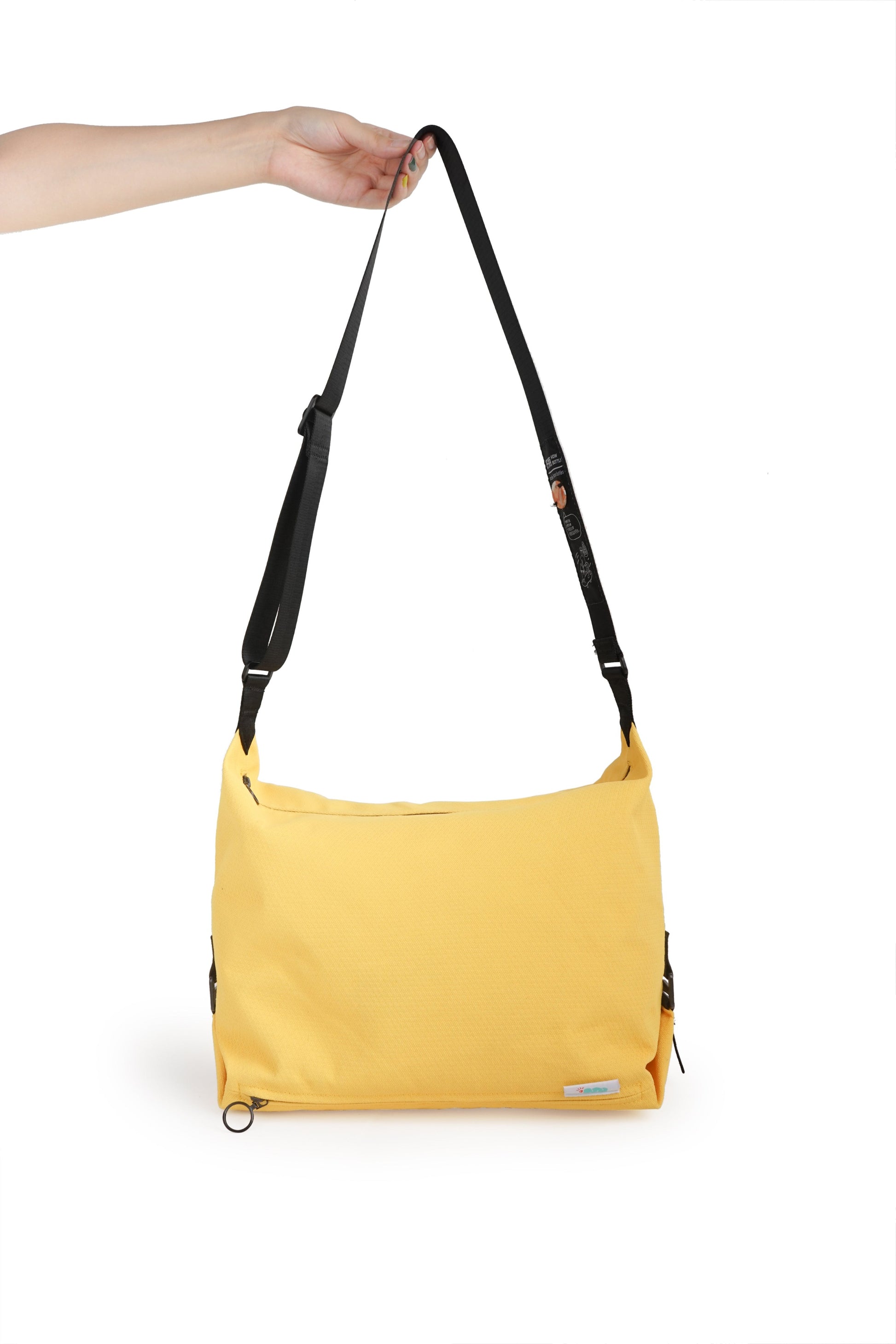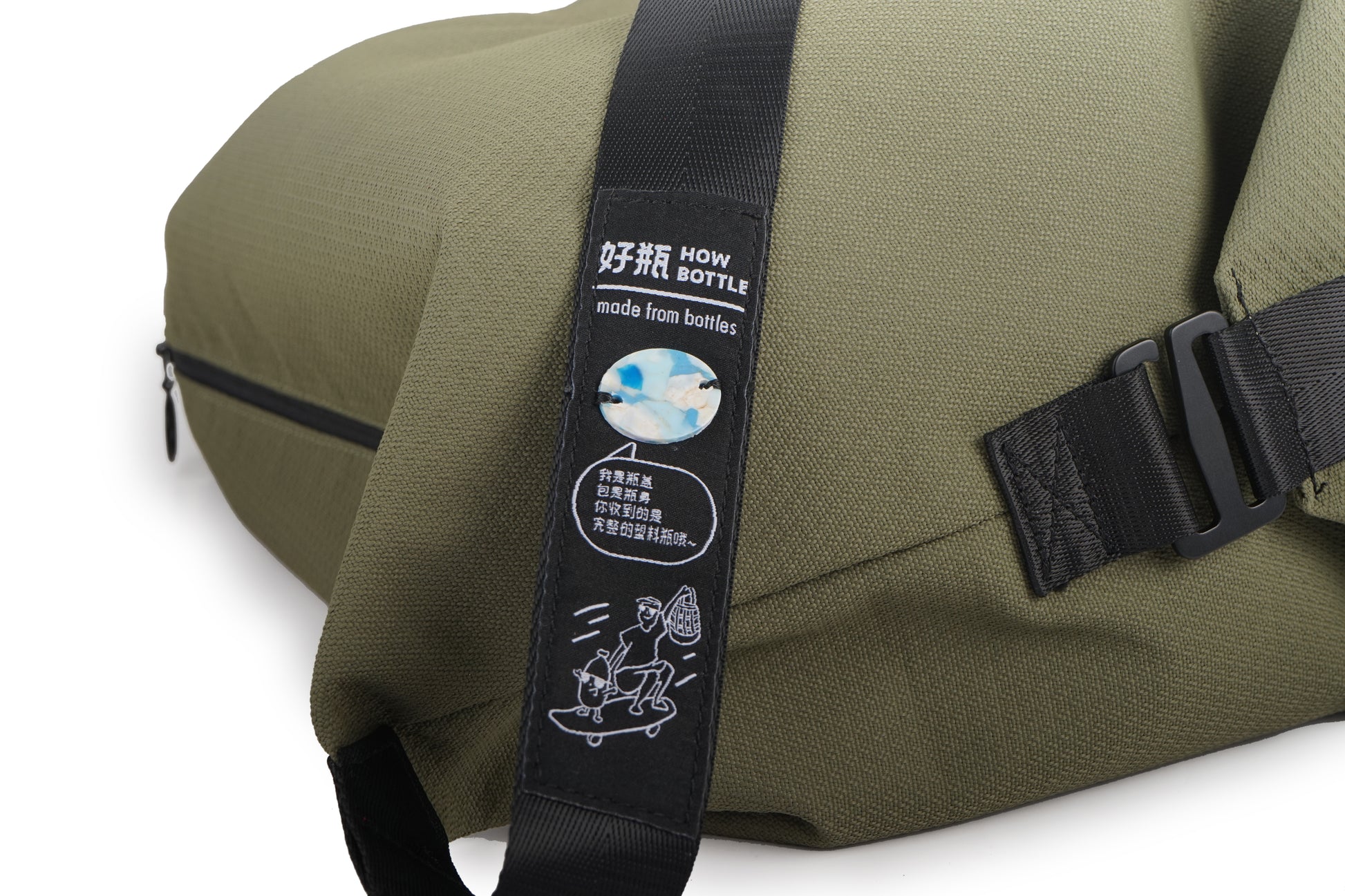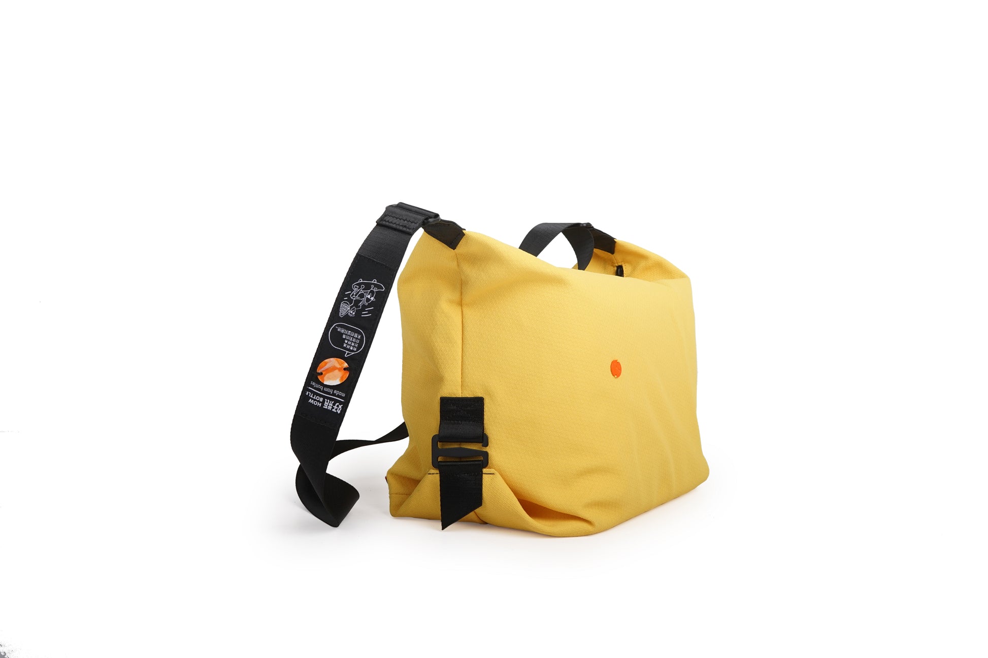 Make a statement with a unique bottle cap decoration on the shoulder strap—this touch of uniqueness completes the eco-friendly design, reminiscent of a plastic bottle.